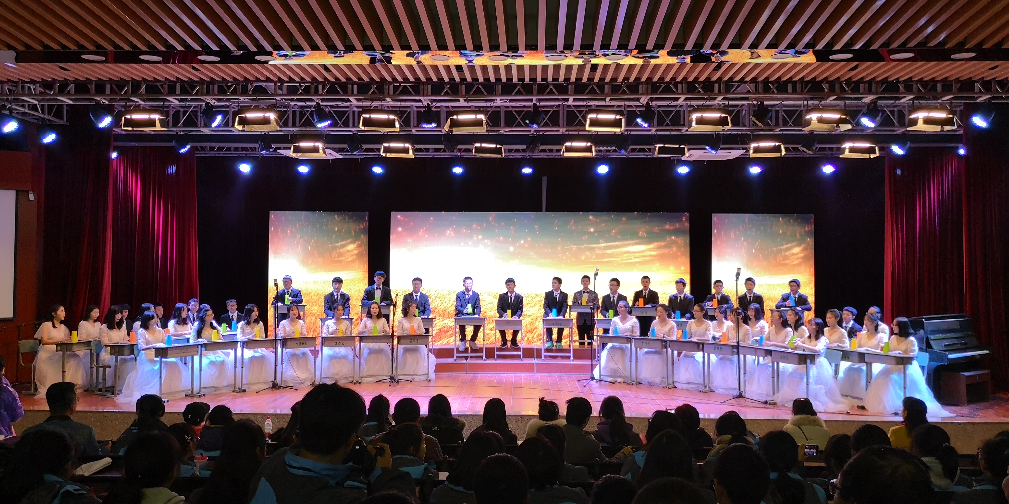 高一一班一出场惊艳全场。服装鲜美靓丽,《康定情歌》嘹亮活泼,《凉凉》婉转凄美,震撼全场。
