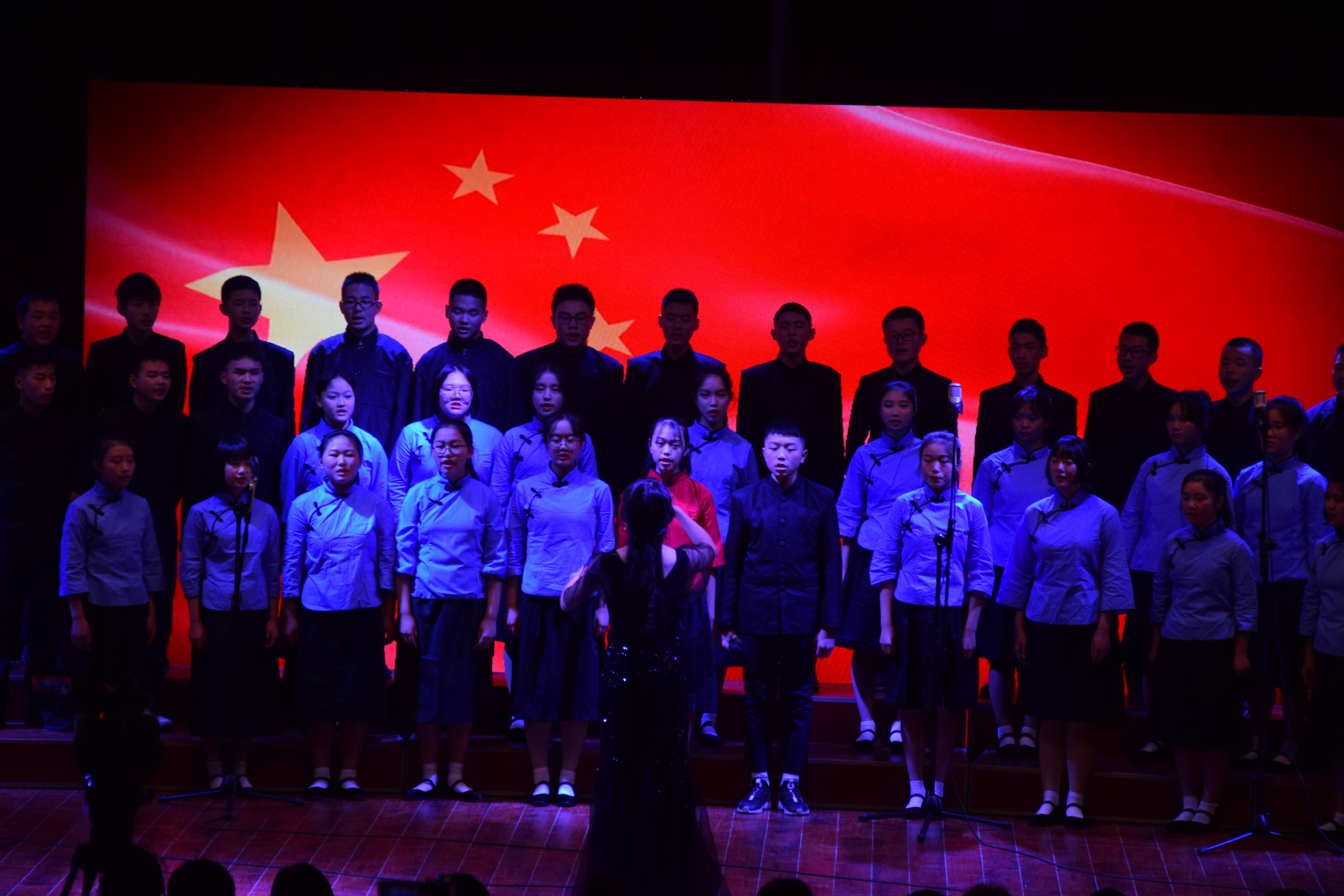 少年强则国强,少年智则国智。少年强则国强,少年雄于地球则国雄于地球,今日之责任不在他人,而在我少年。《少年中国说》,是唱响我们心中梦想的战歌。初三五班带来的《少年中国说》鼓舞人心。你,白雪飘飘,森林无边,群山巍峨,我要把最美的歌儿献给你,我的母亲,我要把美好的青春献给你,我的祖国。初三五班带来的第二首歌曲《我爱你中国》感染了在场的每一位。