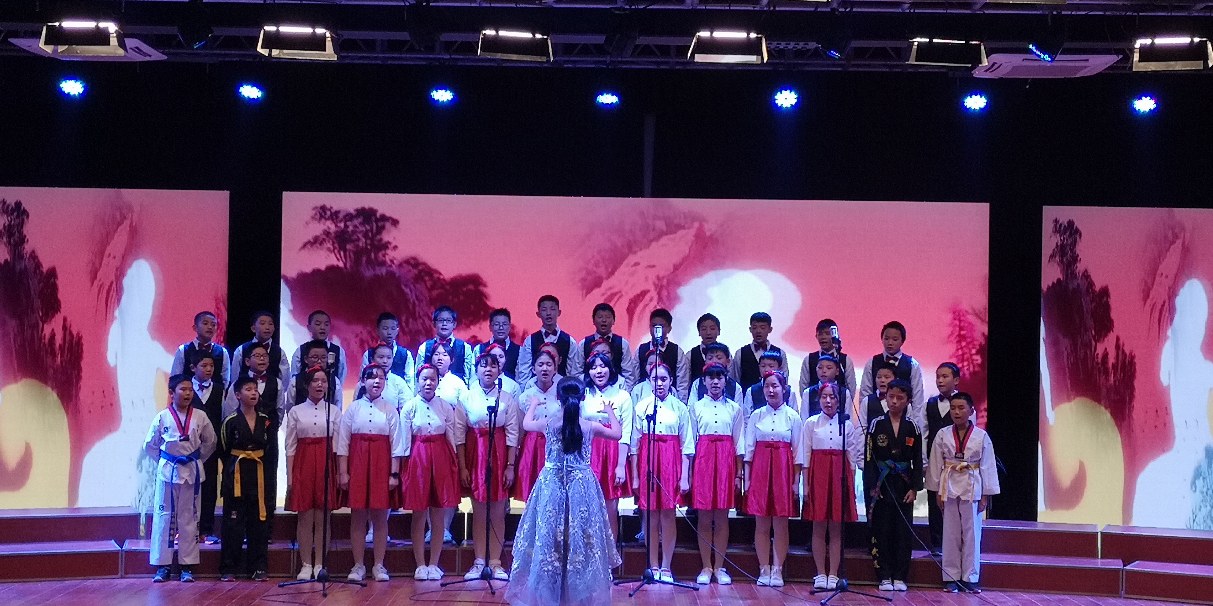 初一五班的《少年中国强》告诉我们中华少年,顶天立地当自强。童年的另一首歌曲《童年》带我们回到了如诗如歌的童年时代;初二三用《游子吟》和《稻香》带给了我们母爱的温暖和童年的美妙。