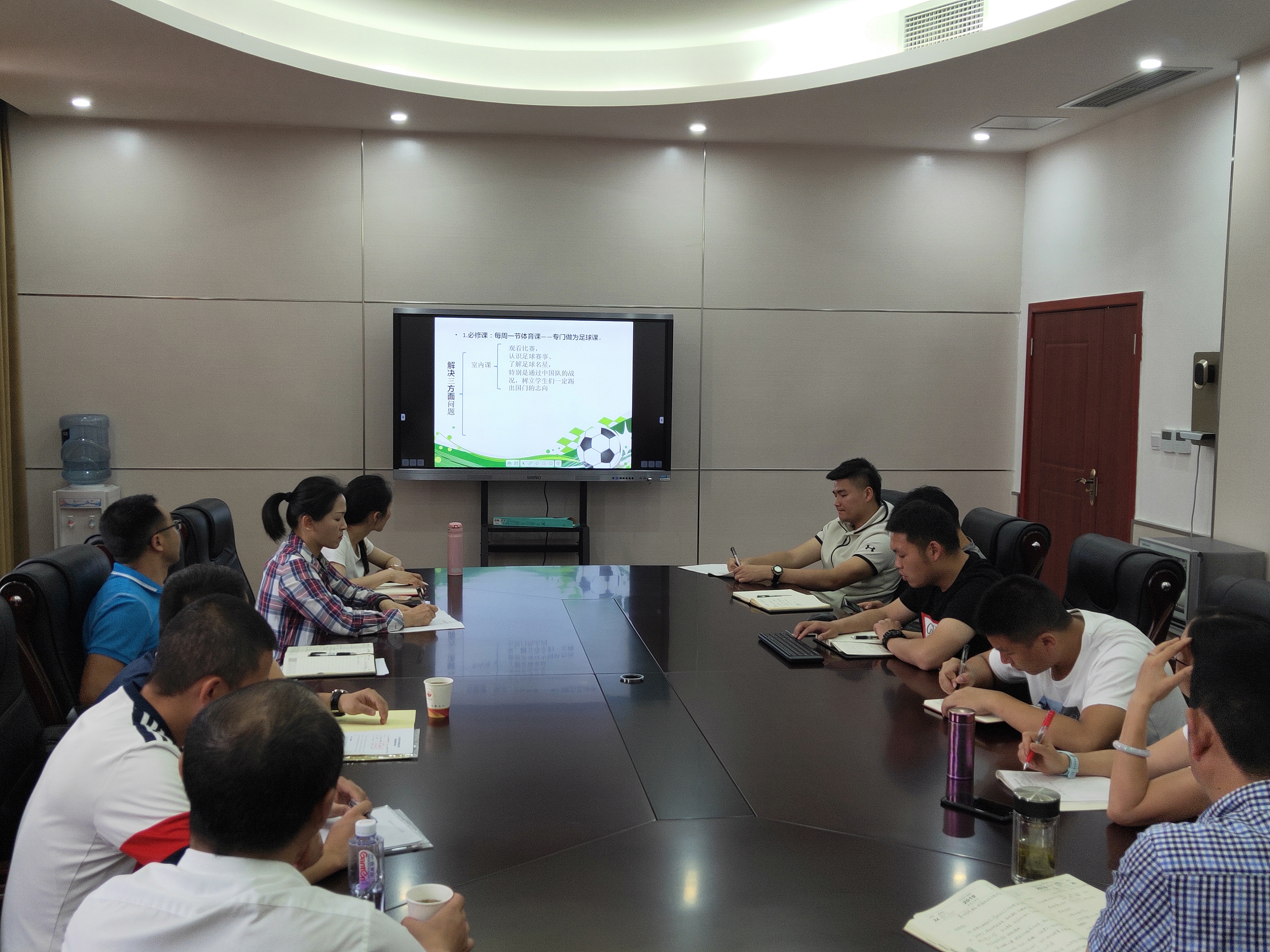 最后谭校长就三个方面做出讲话:1.校园足球教研组的建设,备课组的建设。要做到定点,定时,定内容进行足球教研。并指出足球是我校重点发展项目。2.足球课的重要性,关注学生的发展,由点到线,由线到面全面普及足球技术、文化、精神。3.各级队伍的建设,开展各种级别的足球赛事,今后开展足球夏令营、冬令营等活动。并在明年重建学校足球场等重要工作指示。
