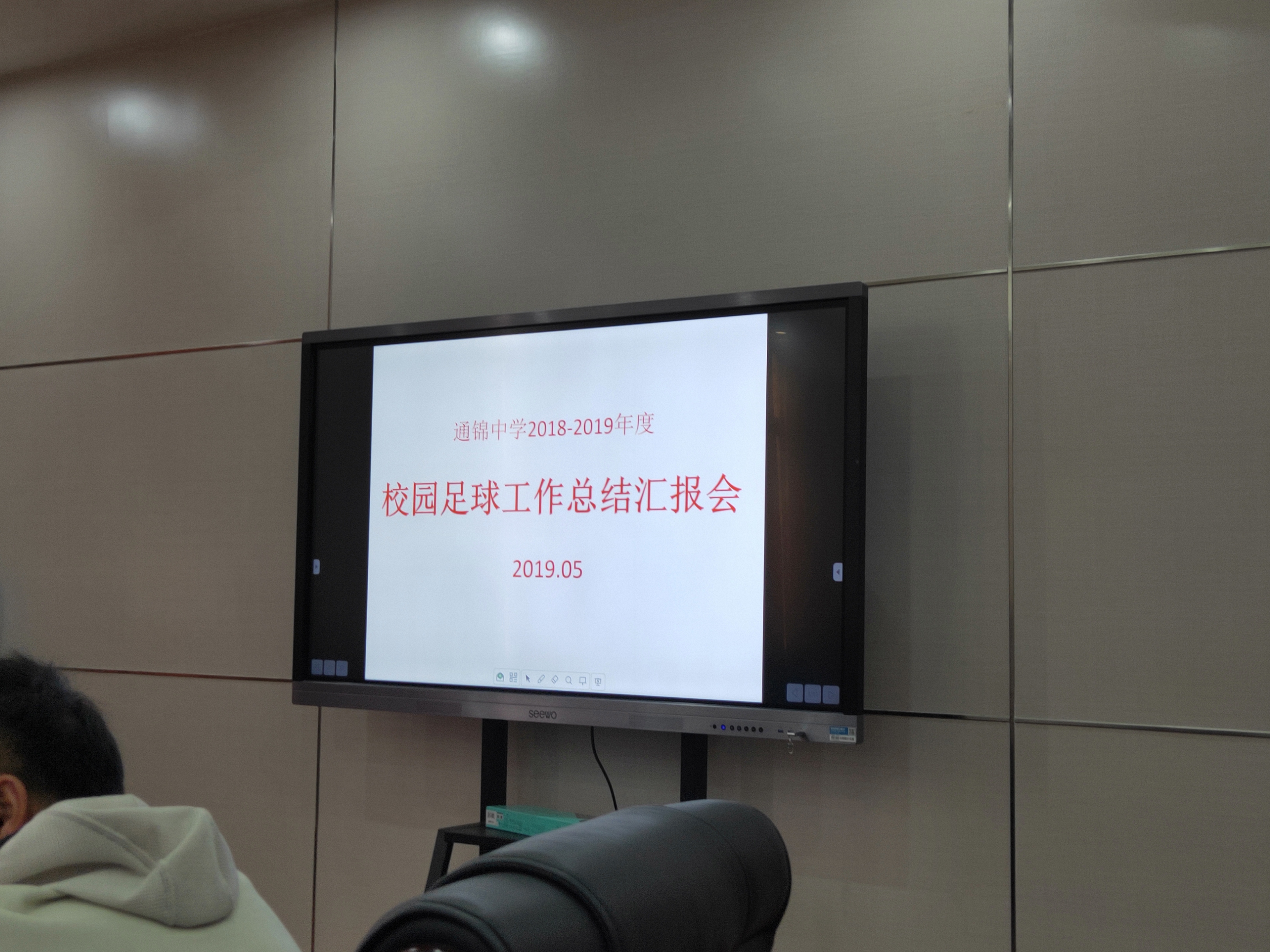 2019年5月22日上午十点,我校召开了2018----2019年度校园足球工作汇报会。参会的人员有:校长谭六三,分管校长陈力,学生成长中心周辉副主任、课管部郑羿副主任、体育组教师以及胜利十一人俱乐部的领导和教练。