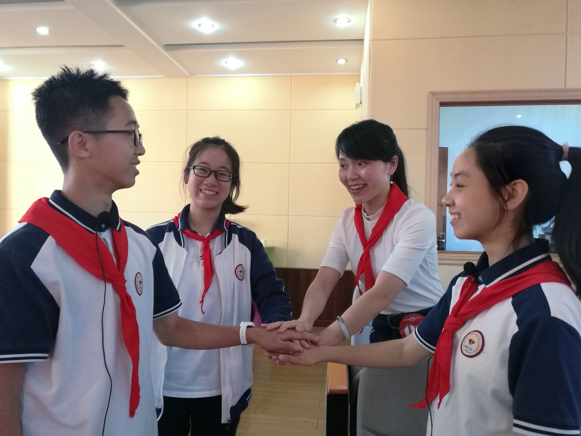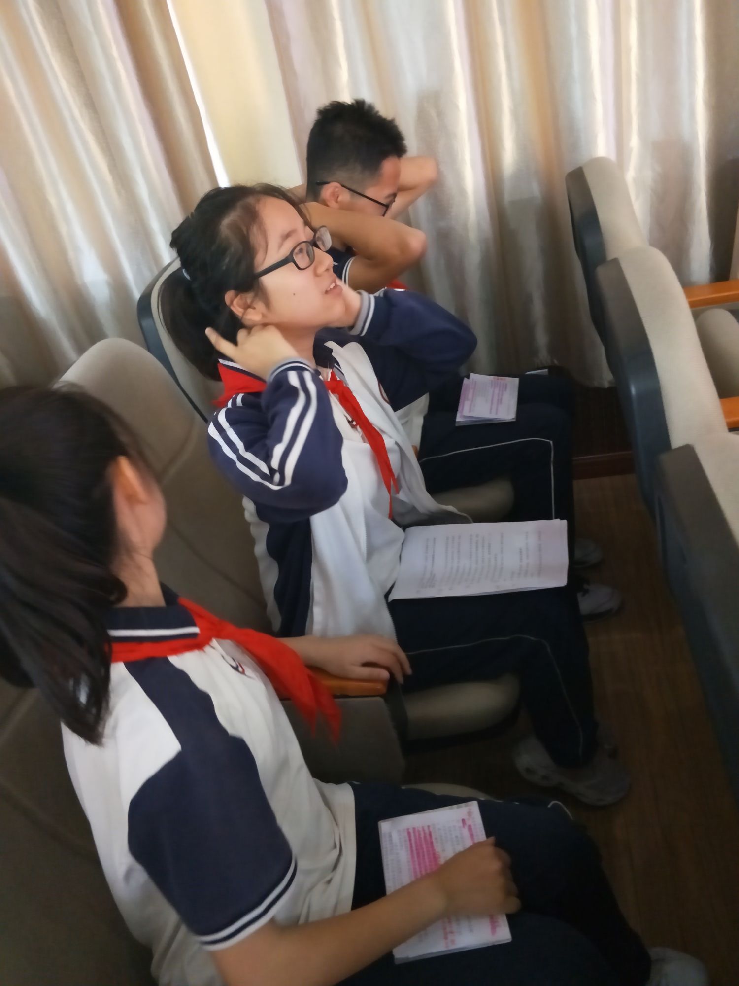 到达赛场后,杨老师指导大家分头进行赛前准备,并细心地为大家整理红领巾。