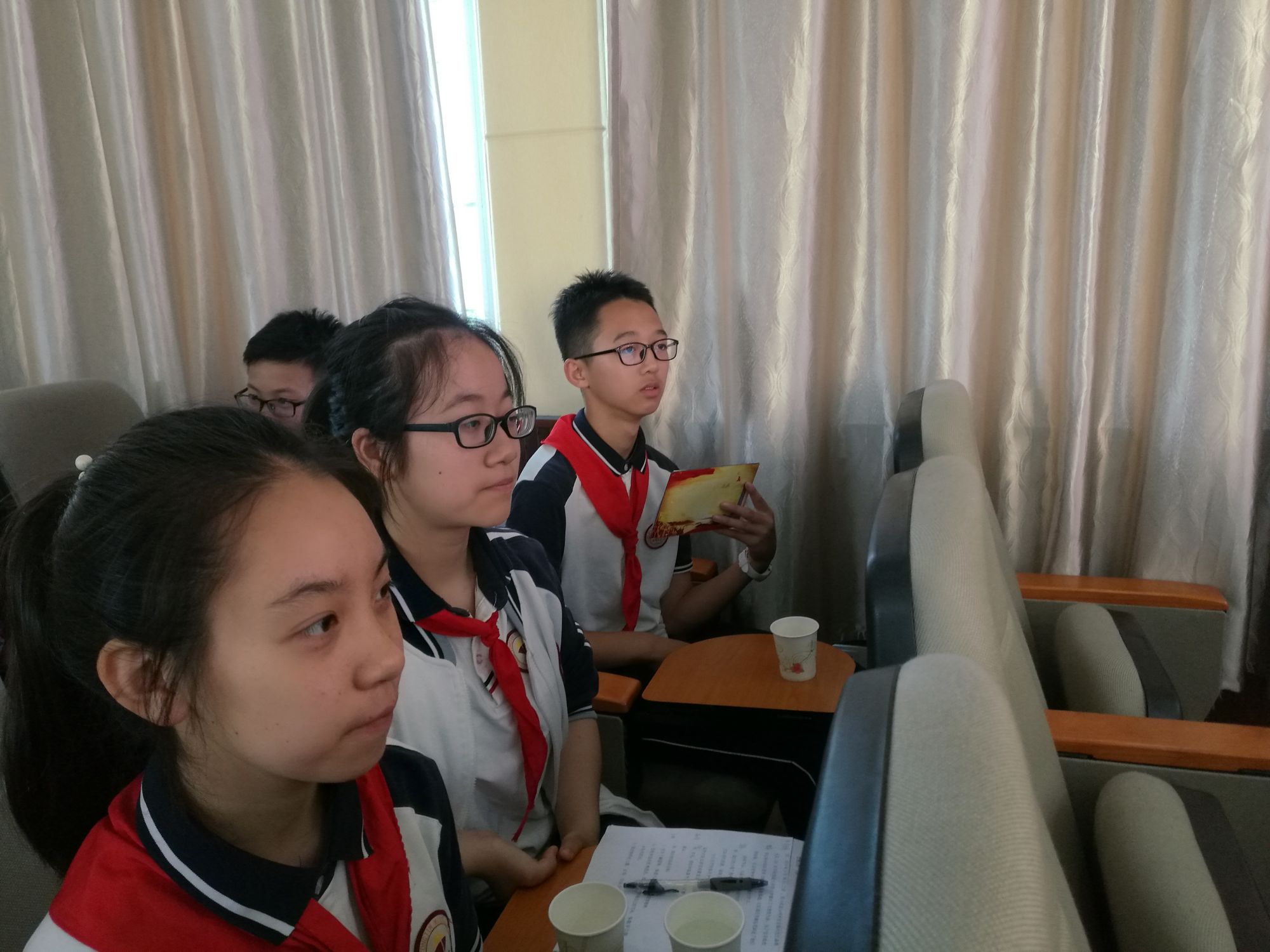 候场时,队员们认真聆听其他参赛选手的说课,不放过任何一个学习的机会。