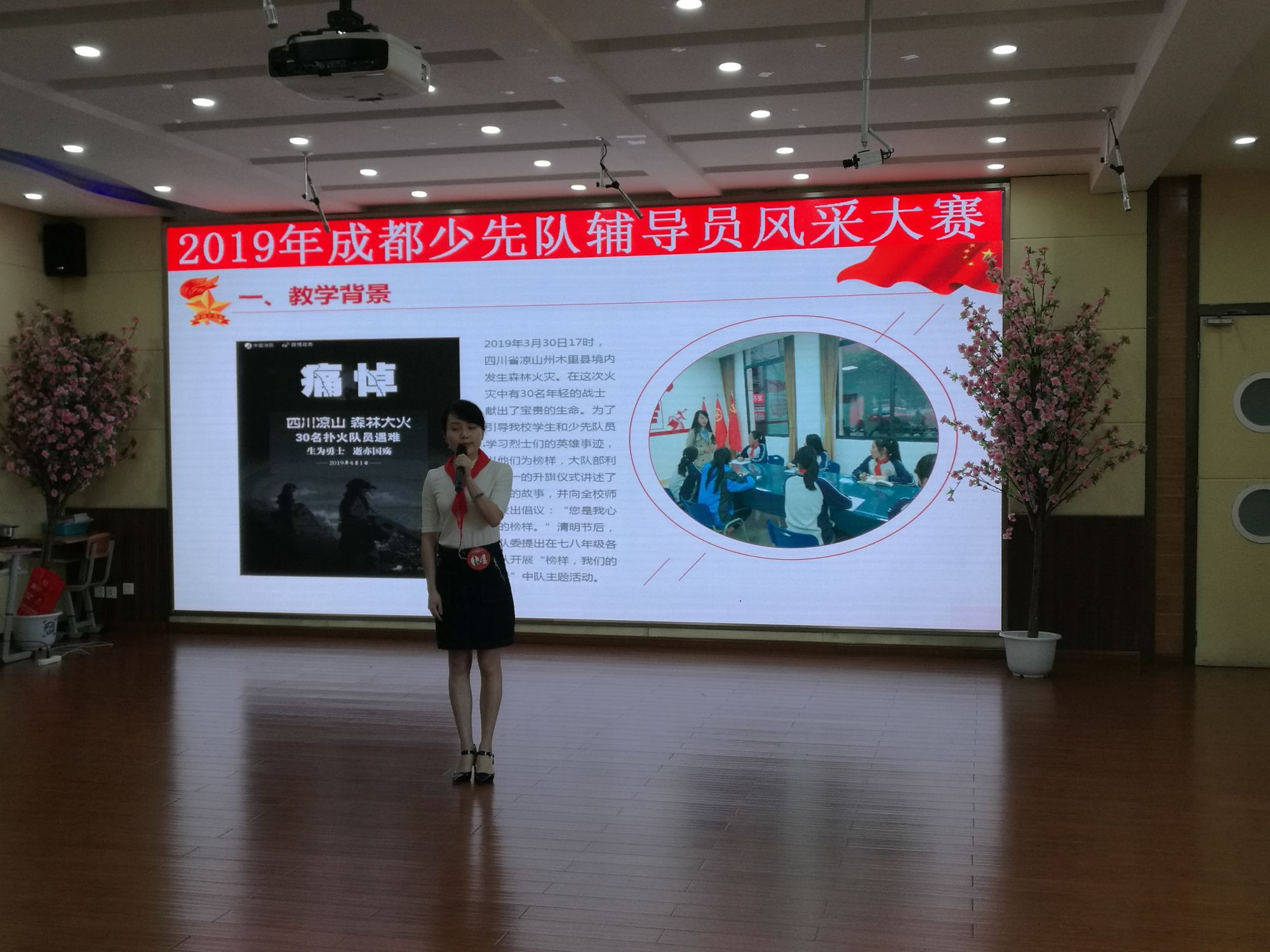 付老师上场了,她从学校少先队工作总结交流会娓娓道来,由“3.30”木里县森林火灾主题教育活动引入,围绕着“寻找身边榜样”层层递进,每一项内容都紧扣着“榜样力量”。她的说课时而娓娓动听,时而铿锵有力,带领着大家一起走进这次总结交流会。