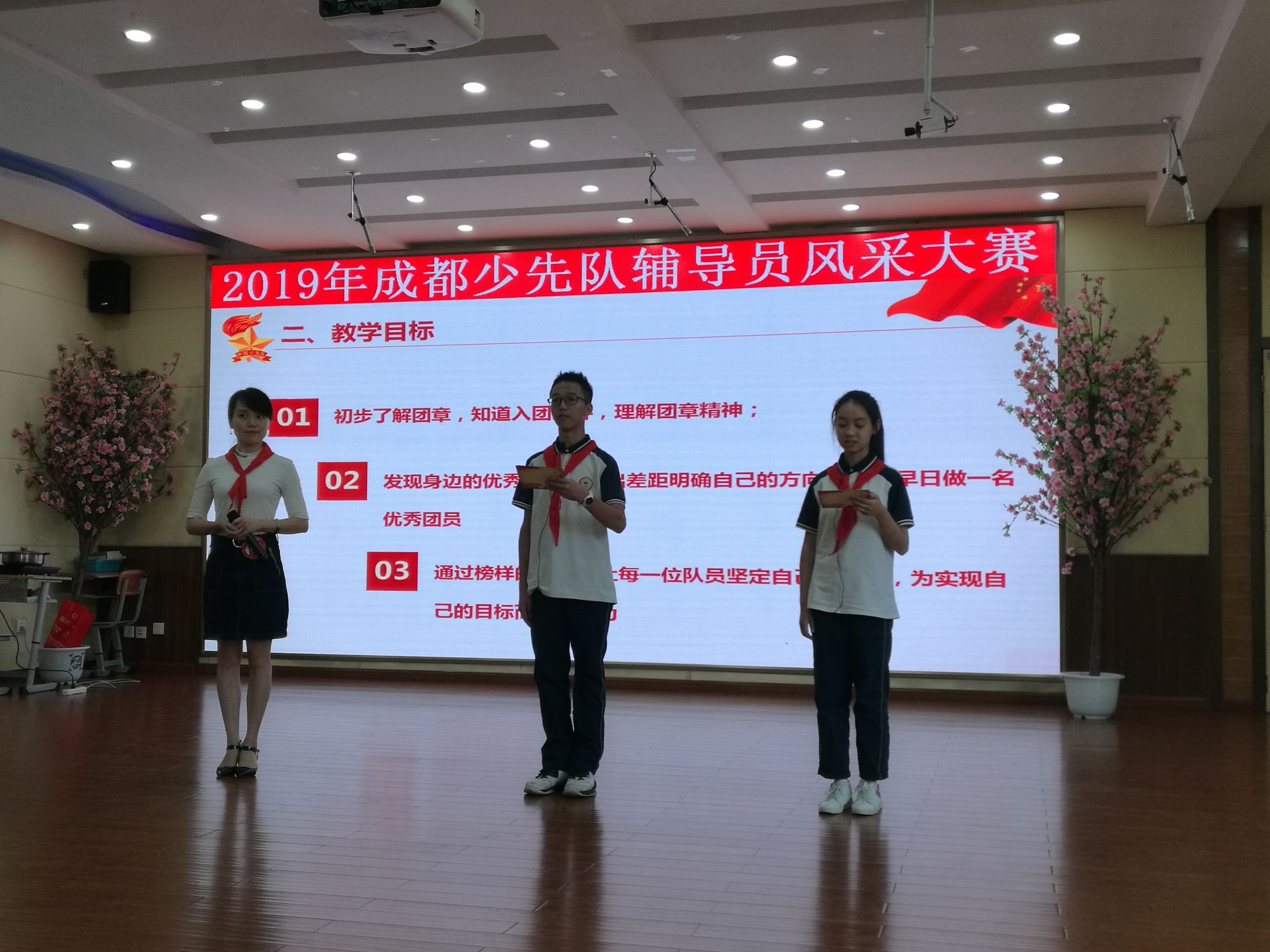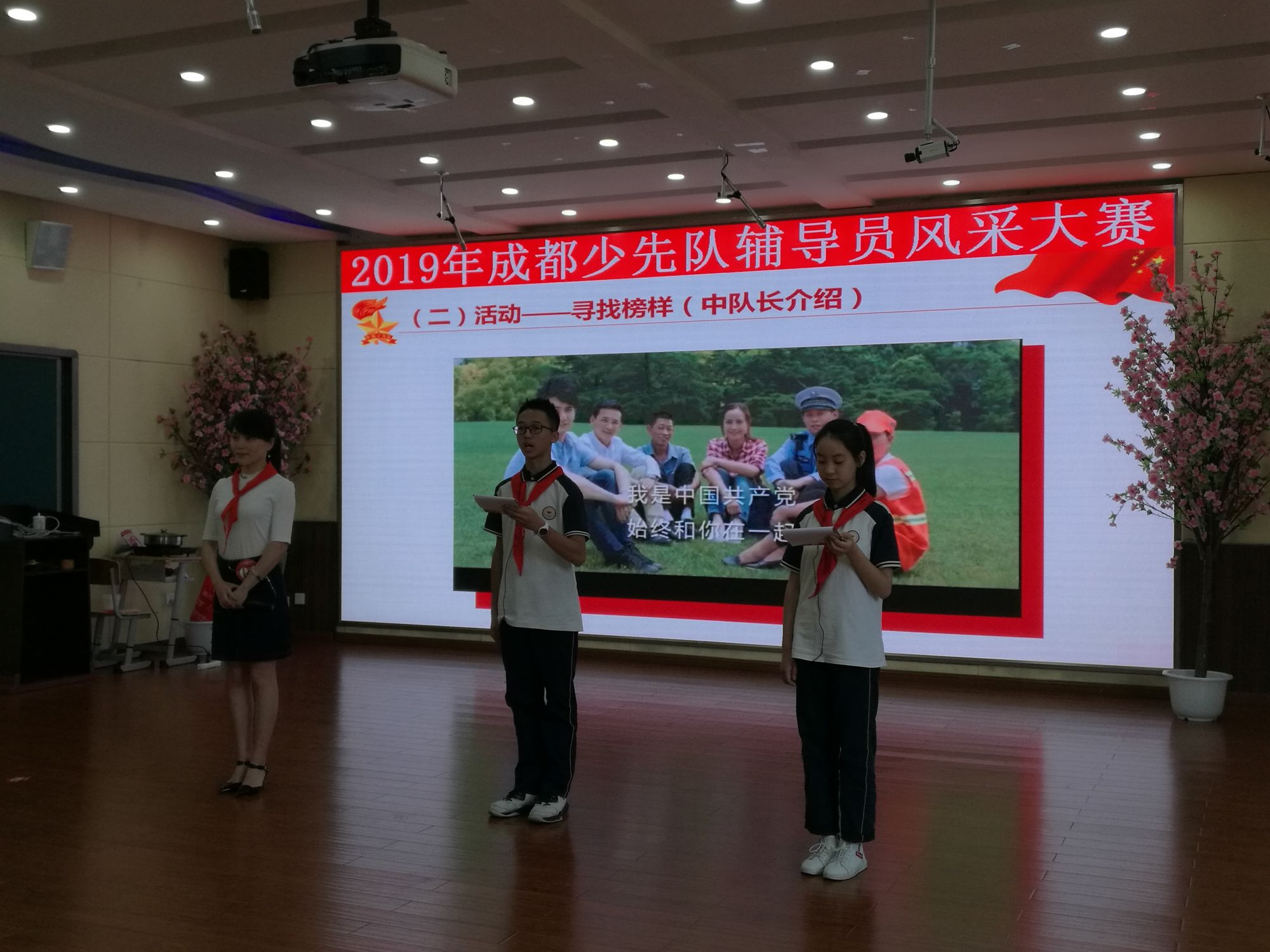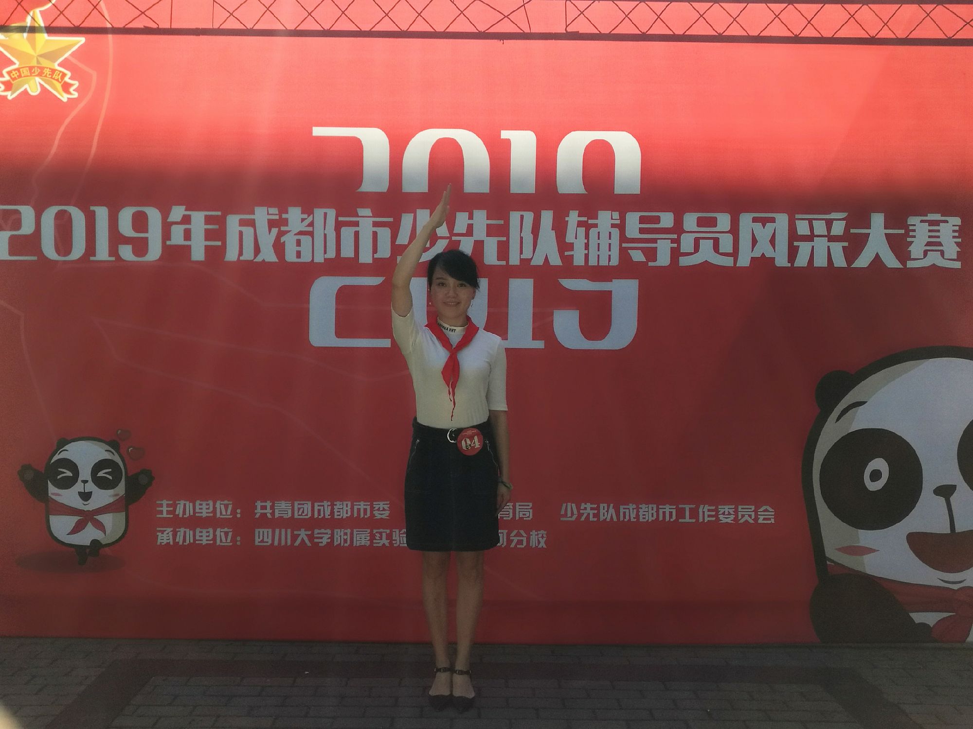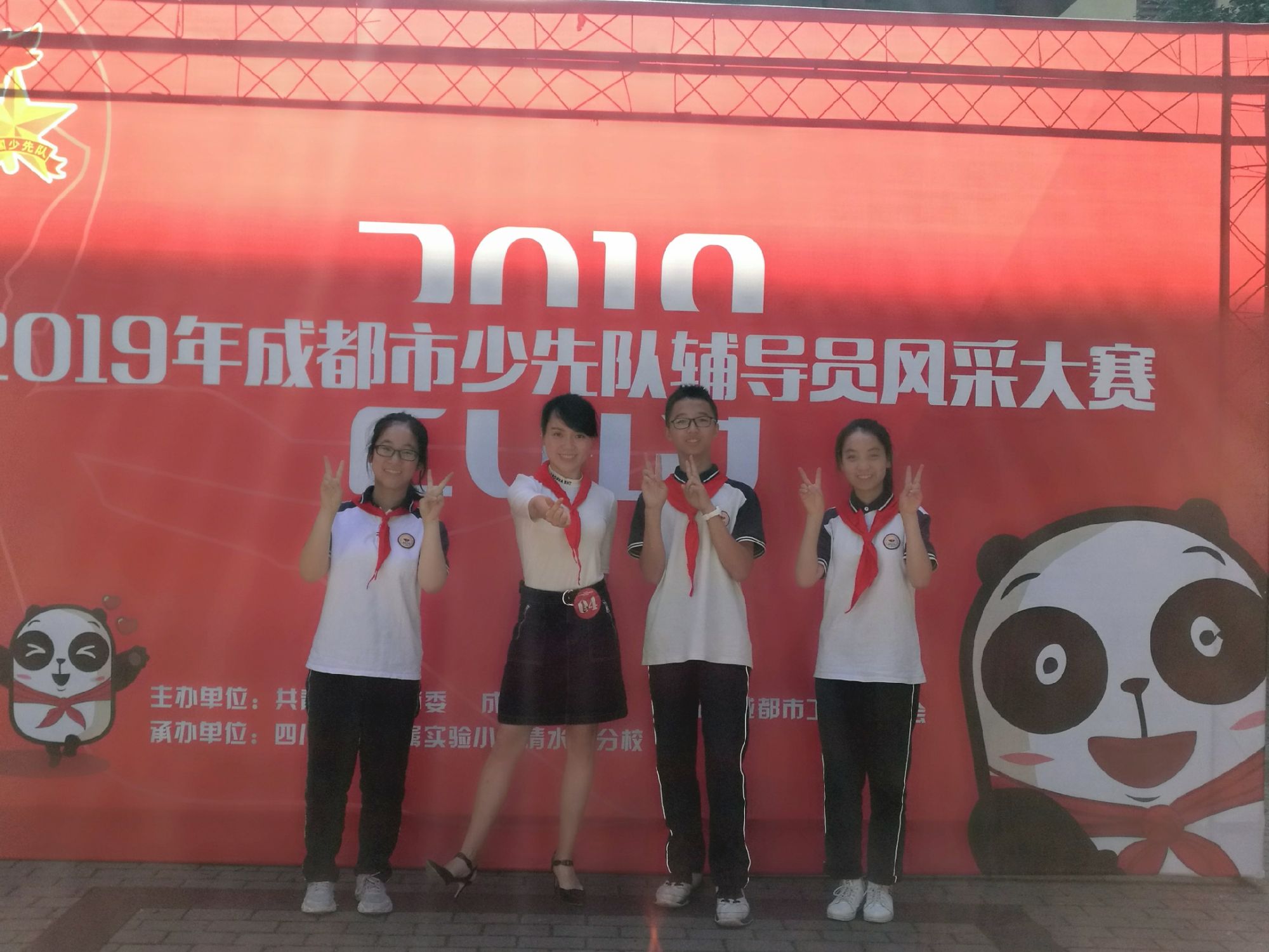 2019年6月5日,我校大队辅导员付婷婷带领三名少先队员,初一六中队刘杨鑫、初二二中队李金容、杨诗语,前往川大附小清江校区,参加2019年成都市少先队辅导员风采大赛,金牛区总辅导员杨秋老师也一同前往加油!