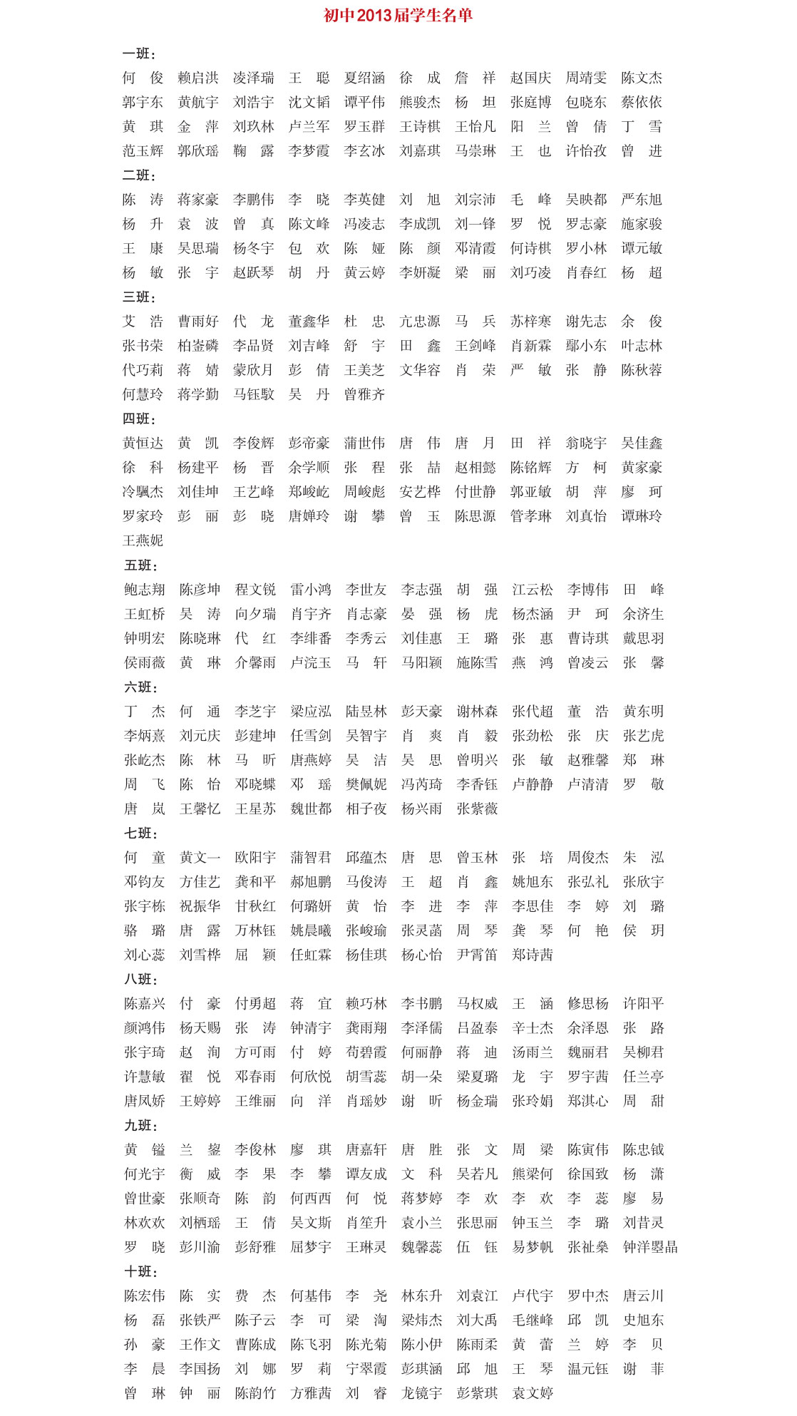 初中2013届部分学生名单