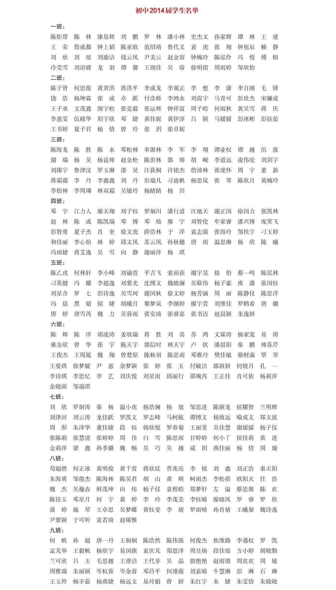初中2014届部分学生名单