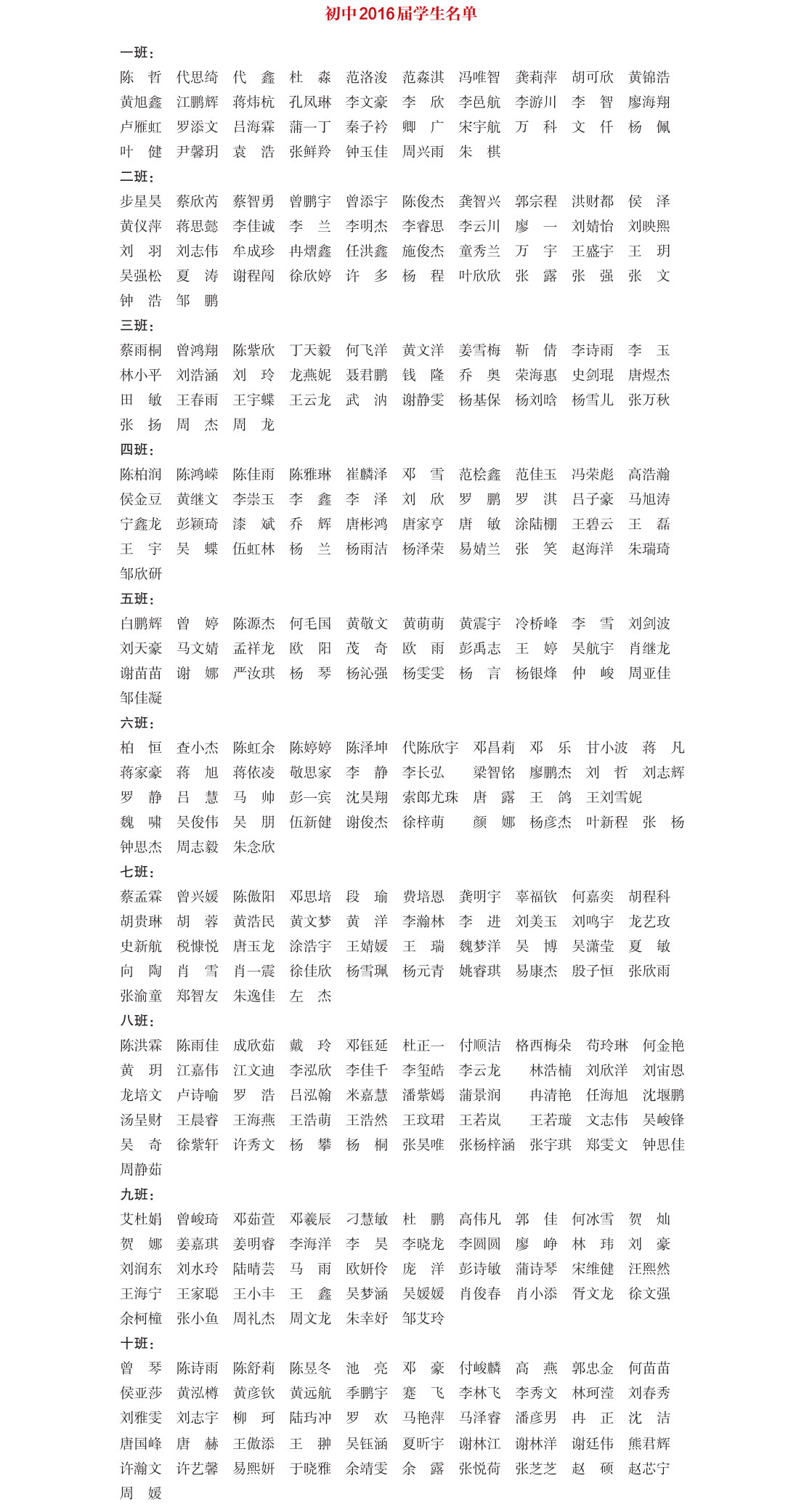 初中2016届部分学生名单