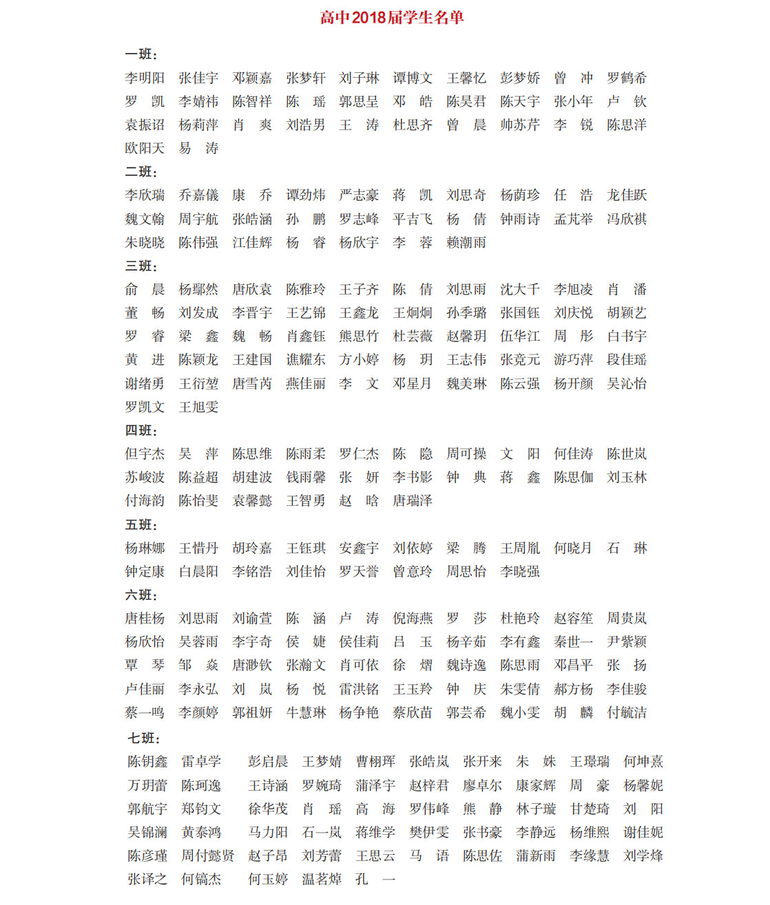 高中2018届部分学生名单